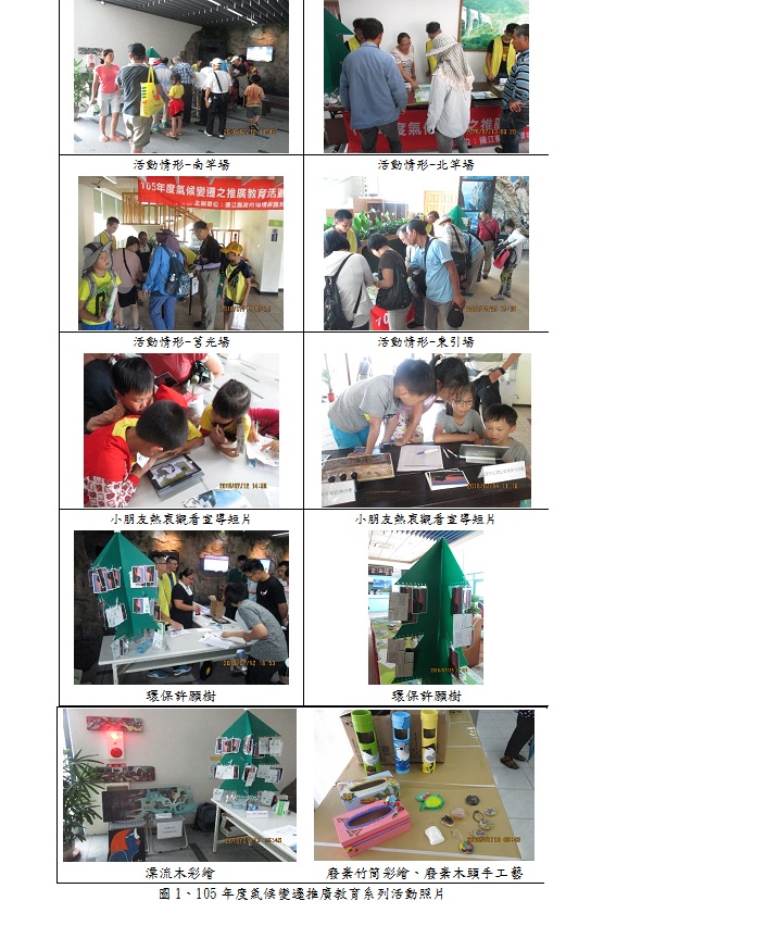 有鑑於此,本府環保局為了讓鄉親了解氣候變遷的影響及其重要性,於七月份起著手辦理一系列氣候變遷宣導活動,目前在7月12日~25日期間,分別於馬祖四個鄉辦理「105年度氣候變遷推廣教育系列活動」,活動統計超過323位民眾共襄盛舉(活動照片如圖1所示),宣導活動採動靜態宣導方式,從遊戲中建立民眾氣候變遷調適的觀念,在動態活動中,透過『記憶拼圖活動』,將環境破壞之圖像及環境警惕標語融入遊戲,讓參與者喚起對愛護環境的同理心,且透過『知識配對大考驗』,從問答中學習日常生活中如何盡個人行動落實節能減碳,提高對環境友善的行動力;靜態宣導則藉由宣導短片的撥放,凸顯出人類在地球上的行為及科技的進步對地球及生態造成的各項傷害,在滿足個人所需時往往沒想到後果的嚴重性,等地球破壞待盡,連外星人都撻伐,藉以宣達地球只有一個的重要性。