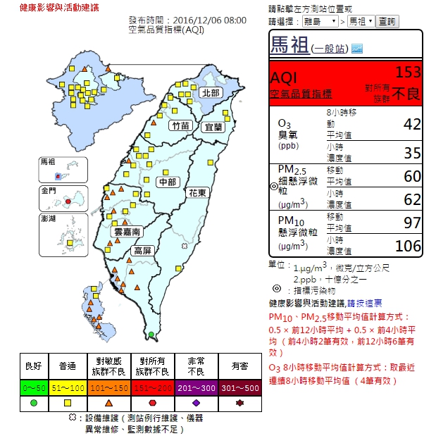 目前空氣污染指標(AQI)已達紅標(污染物:PM2.5),對所有族群有不良影響,敬請民眾避免外出、從事戶外活動及配戴口罩加以防範。