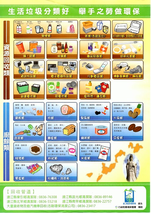 【記者曹重偉報導】連江縣環境資源局推動資源回收多年有成,根據該局統計,連江縣105年1至11月垃圾產生量統計約為5600噸,資源回收率30.54%、巨大垃圾回收率13.56%、廚餘回收率19.36%,整體垃圾回收率達63. 46%,為全國第三;局長張壽華指出,優良成績反映出「資源循環、垃圾分類」獲得鄉親們大力支持,期許大家持之以恆做好垃圾分類、資源回收工作,共同維護本縣環境。