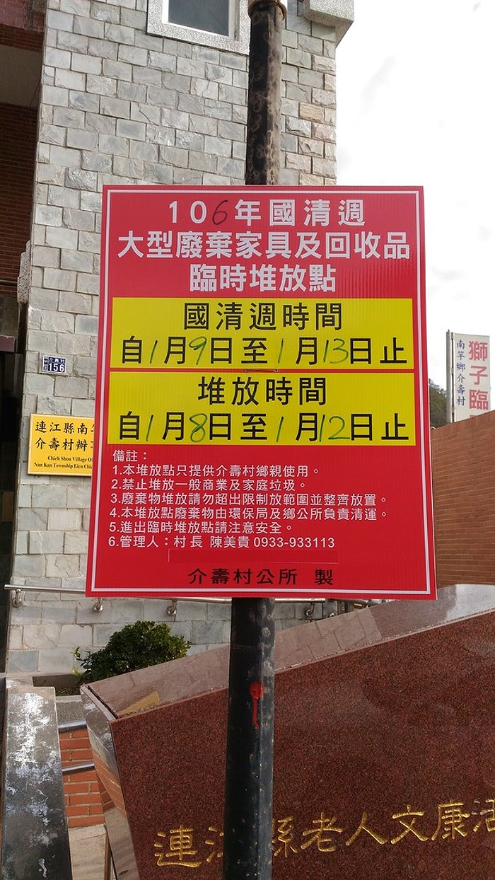 連江縣環境資源局及各鄉公所表示,請家戶按規定日期堆放。