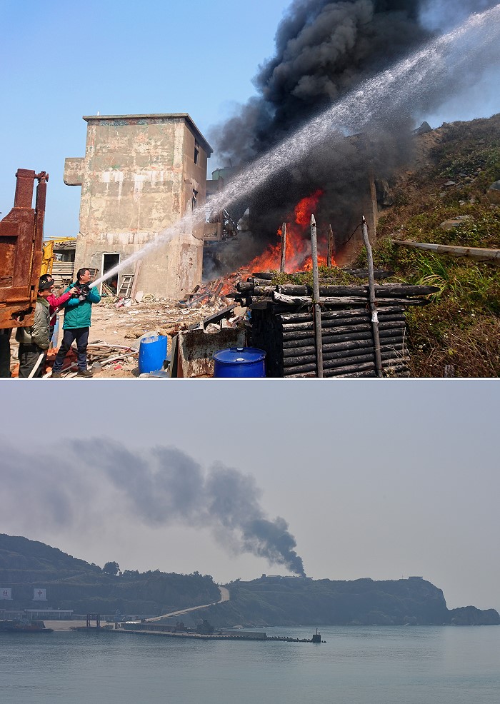 昨天上午11時左右,靠近直升機停機坪的堆置場突然升起濃濃黑煙,直沖天際,遠在西引島都能清楚看見。消隊分隊趕抵火場,才發現是營造廠商露天焚燒廢棄木材與垃圾,火勢熊熊引發大量黑煙。在掌握現場情況後,消防隊員先以水柱噴灑四周的草坡,防止火勢擴散,接著再滅火。