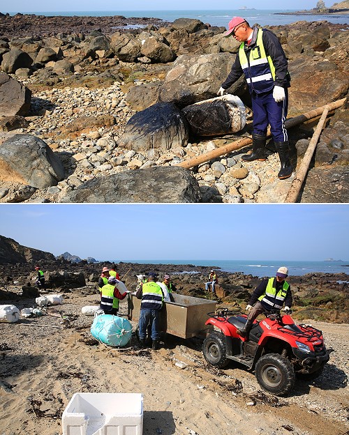 27日上午莒光鄉公所東莒環保人員在執行淨灘工作時發現有部分區域重油污染,立即通報環保課並著手清理,避免隨著潮汐擴大污染面積。