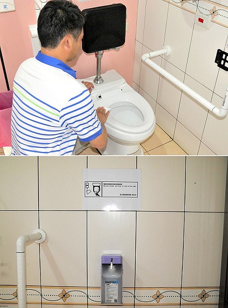 因應民眾建議,環資局特於6月起在公廁的座式馬桶間內加裝消毒酒精架,目的就是為了讓大家消毒便座,使用前消毒一下,擔心被傳染的使用者就不用半蹲或是站上馬桶上,這樣其實相當危險;環資局也提醒大家上廁所前可以先消毒,讓多數的病毒遠離你,使用完畢也請記得沖水、洗手及保持乾淨喔!