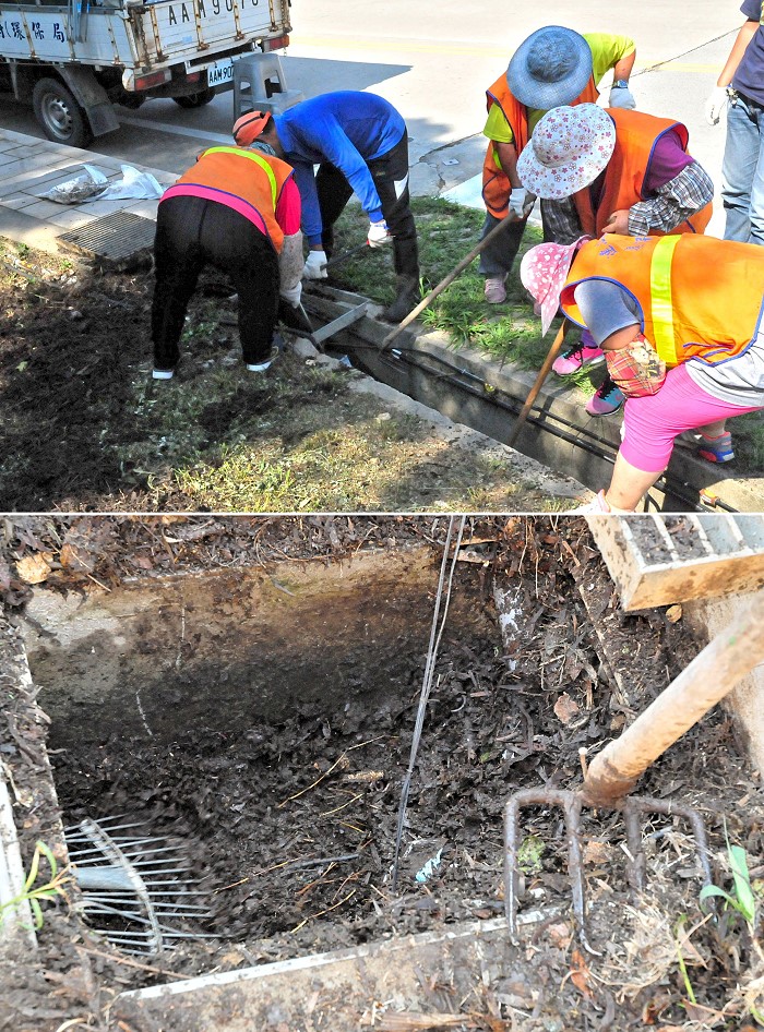 環資局表示,以往每次颱風來襲之前,均會派員前往各村以人力疏通水溝,今年特別未雨綢繆提前展開勘查及清理作業,並加派人車把堵塞水溝的樹葉、人造垃圾等予以清除,使整體工作更有效率。