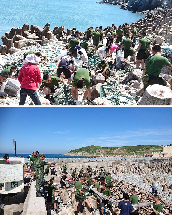 2天的清淨行動,東引指揮部動員60餘人次協助淨灘,指揮官廖建興少將也到場關心,給弟兄加油打氣。炎熱高溫的天氣下,國軍揮汗清理清運大批長短不一的竹竿、漂流木等垃圾,經過二天的努力終於讓東堤恢復乾淨面貌。