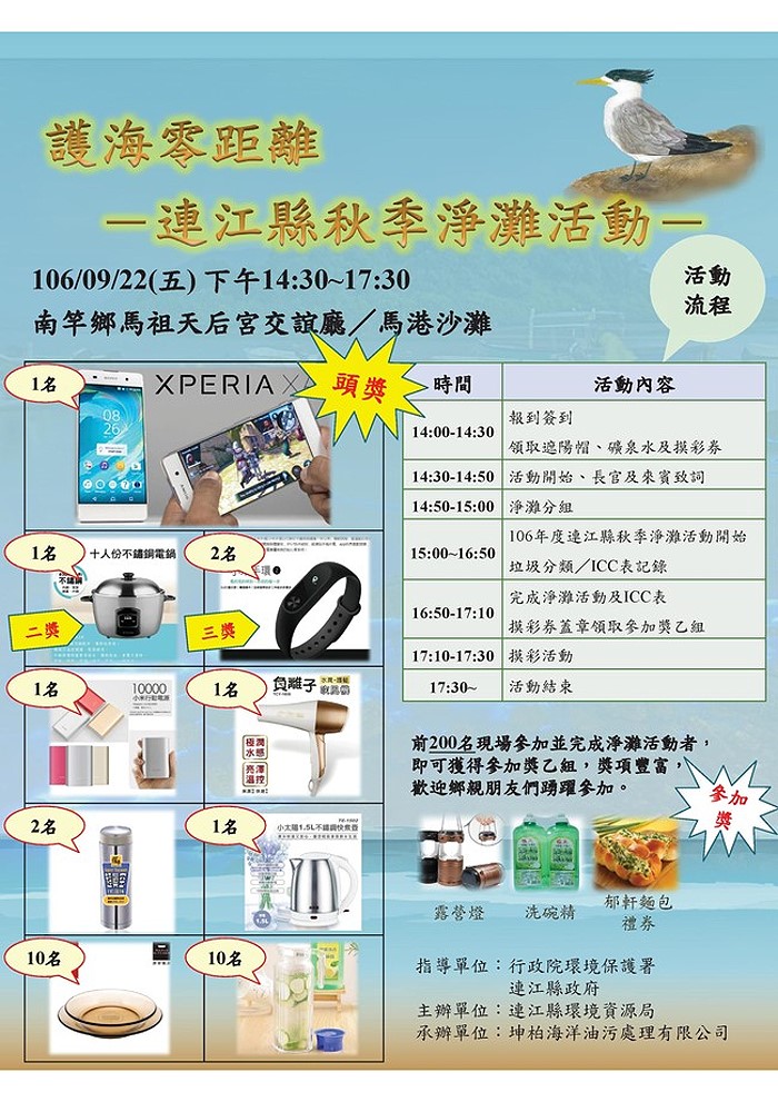 【本報訊】連江縣環資局主辦、坤柏海洋油污處理有限公司承辦護海零距離-連江縣秋季淨灘活動,22日下午2時30分於馬港沙灘舉行,歡迎鄉親朋友們踴躍參加,一起認識海洋污染防治及舉手愛環境。活動當天全程參與者送精美禮品,數量有限送完為止,並可登錄環境教育時數3小時,還有摸彩活動等你來抽好禮。